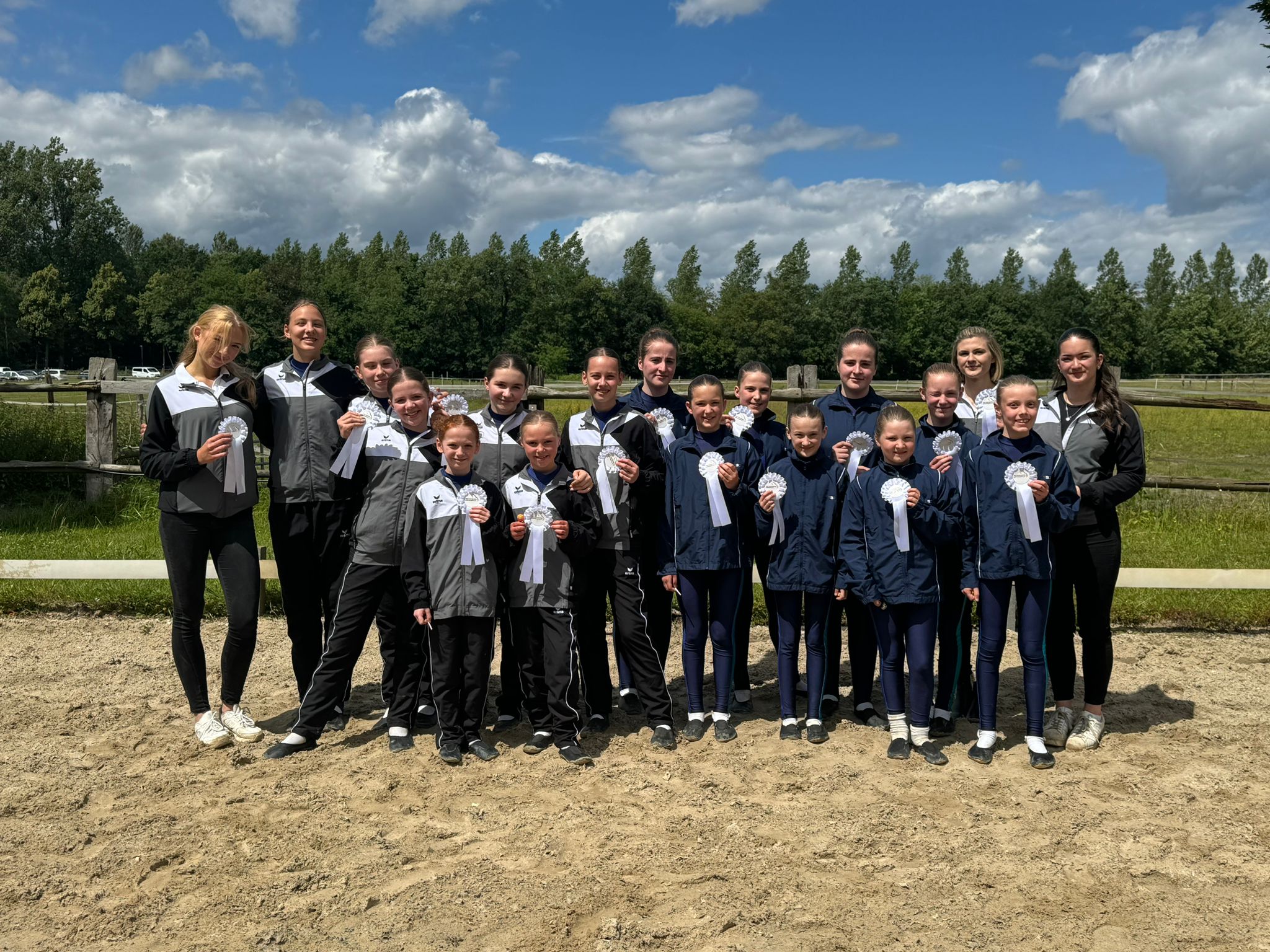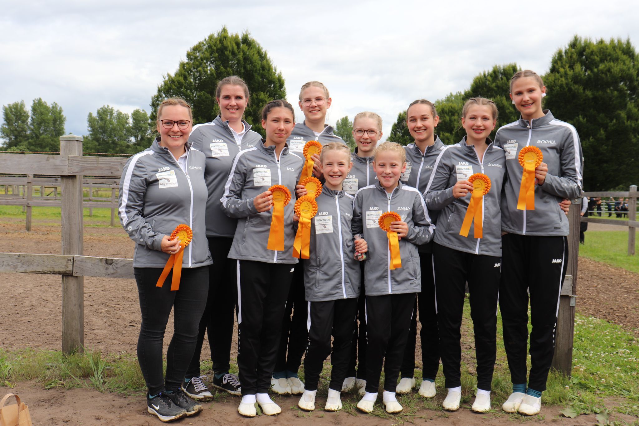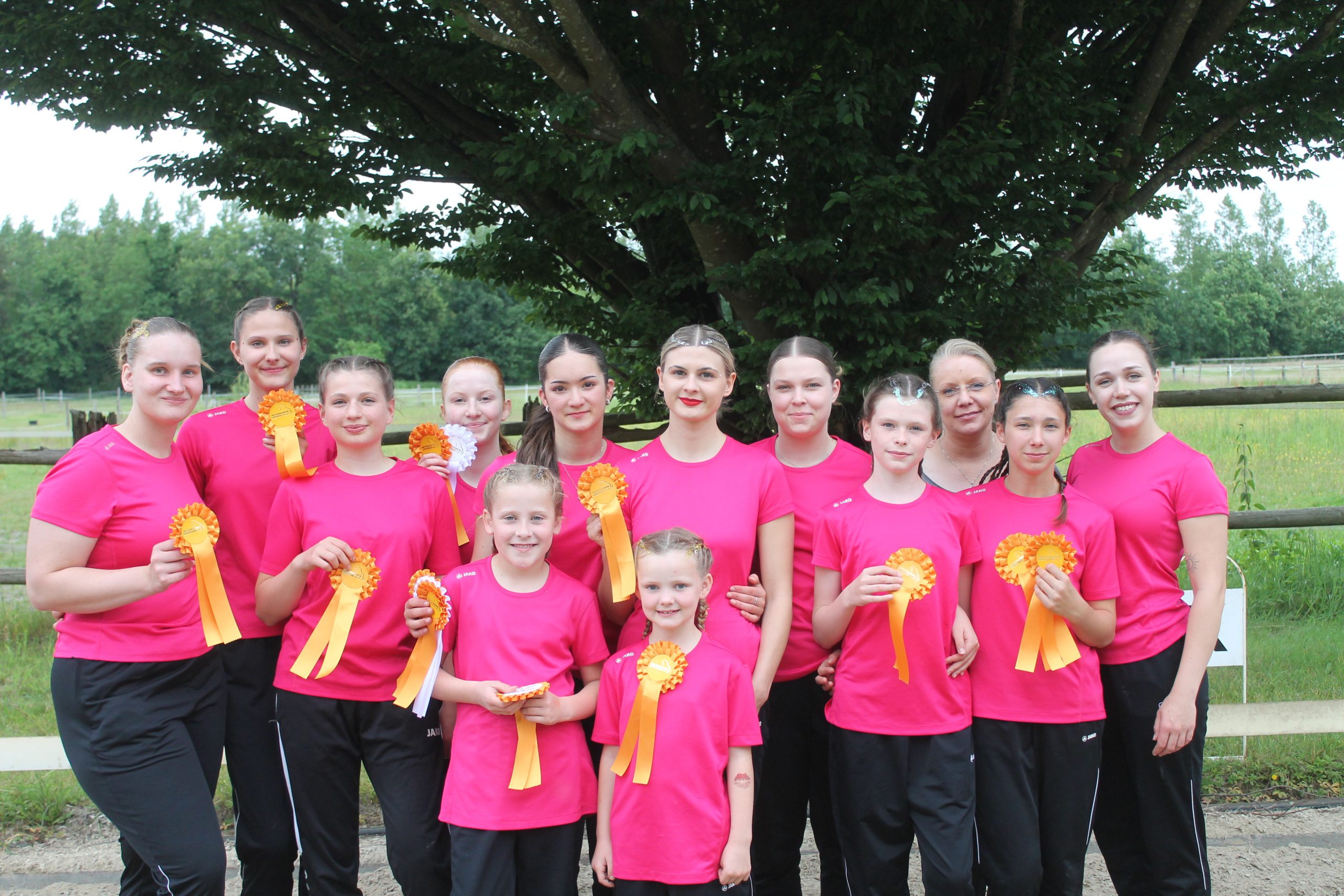 Am Nachmittag zeigte die H1 von Trainerin Claudia Röttgen ihr Können in diversen Holzpferdeprüfungen. Auch hier gab es einige goldene Schleifen: Die Gruppe zeigte eine tolle Kür mit viel Ausdruck und wurde mit dem ersten Platz belohnt.
